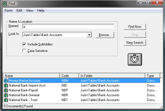 The Finder in Juris may be used to search throughout Juris, but will be pre-populated with the appropriate defaults for searching only in Bank Accounts when the steps below are used.