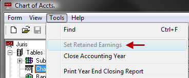 Have all users exit the program, and place Juris in Maintenance Mode to assure that no users log in until this procedure is complete. Juris recommends that a backup is performed prior to setting retained earnings. Once the Set Retained Earnings function has been completed, it cannot be undone except by restoring from a backup.