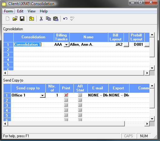 If multiple consolidations are created for a Client, clicking on the consolidation in the Consolidation spreadsheet will show the corresponding addresses for that consolidation in the Send Copy To spreadsheet, and will allow changes to be made for address assignments as well as allowing additional addresses to be entered for that consolidation.
