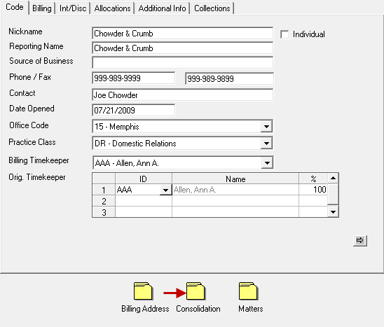 Consolidations may be established to bill multiple matters on the same invoice (Consolidated Billing). The Consolidation must be established first, then matters can be assigned to that consolidation. Each client may have one or more consolidations, but each matter may be assigned to only one consolidation.