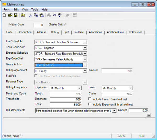 - Enter Billing Thresholds for Expenses/Fees. Threshold defaults will be established in Firm Options. Threshold billing is activated when Prebills are printed By Frequency. When posted fee or expenses reach or exceed thresholds, the prebill will be generated even if it falls outside established Billing Frequencies for that item. If the prebill prints only because the Fee Threshold was met, then only fees will print. If it prints because the Expense Threshold was met, then only expenses will print.