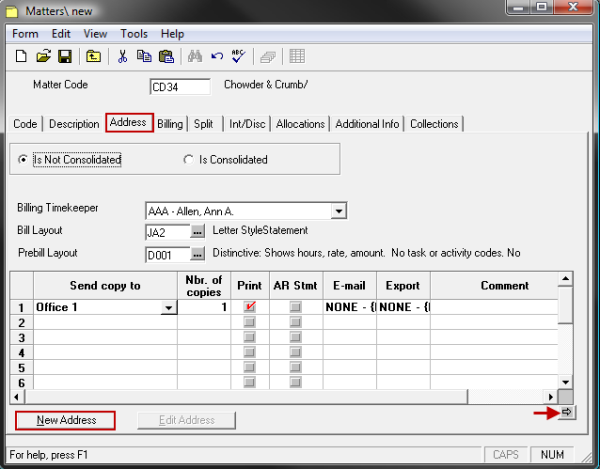 If the Matter is NOT to be Consolidated, then a billing timekeeper, prebill format, bill format assignments, and billing address information must be entered here. If the Matter IS CONSOLIDATED, then the Consolidation must be selected here. (The must be established before the Matter can be added to the Consolidation.) See Consolidation for more information.