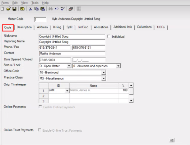 - Many of the default values supplied on the following tabs are pulled from the selections made on the related Client form. These defaults may be changed to any valid value as applicable to the individual Matter.