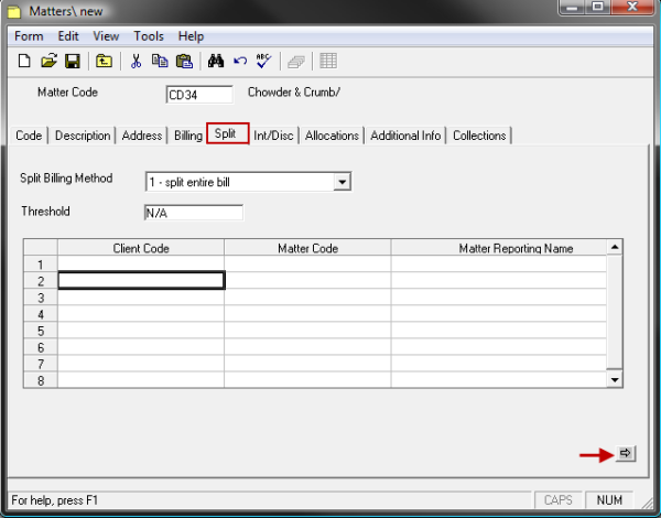 In the spreadsheet, enter the Matters that the bill should be split to - and for each 'split to' matter, enter the percentage of the bill that should be split to that matter.