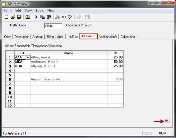Enter or select Fee Schedule Code. The fee schedule assigned to the Matter will determine the Timekeeper rates used.