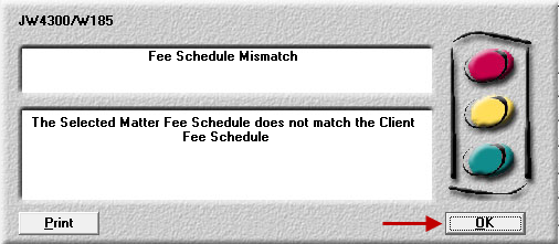 If the selected Fee Schedule does NOT match the selected Client Fee Schedule, a mismatch warning box will appear. Click the OK button and make the appropriate changes so that a match occurs.