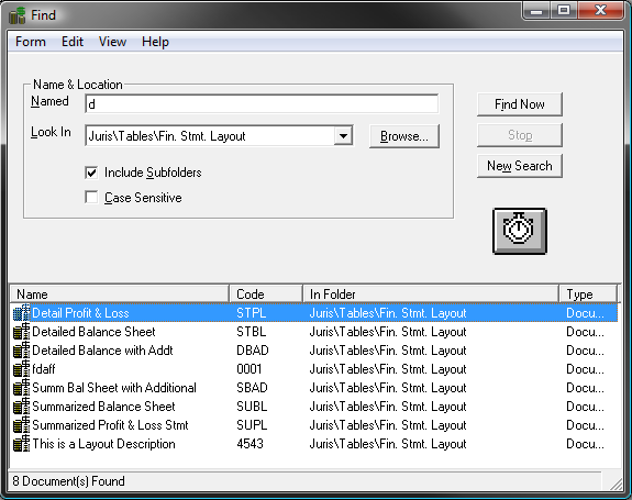The Finder in Juris may be used to search throughout Juris, but will be pre-populated with the appropriate defaults for searching only in Financial Statement Layouts when the steps below are used.