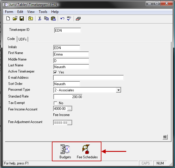 Timekeepers are automatically added to the firm's Standard Fee Schedule as defined in Firm Options. They can also be assigned to additional Fee Schedules if needed, and may be designated on Expense Entry as the "Incurred By" Timekeeper. User-defined fields can be created for timekeepers as well.