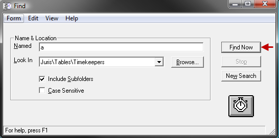 You can search for a timekeeper using the Finder in Juris, which is pre-configured to search only in Timekeepers when you follow these steps: