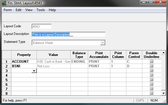 - LEGEND - Prints predefined Legend depending on Statement Type being defined. Used to underline numeric (number) columns. Typically used with statement sub-totals and grand totals.