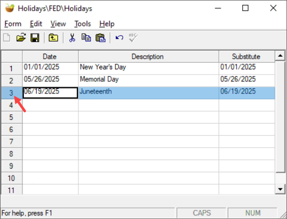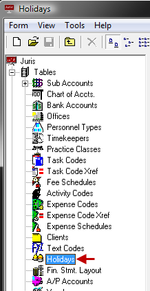 - Click the New icon on the toolbar. This opens the Juris\Tables\Holidays\ New window.