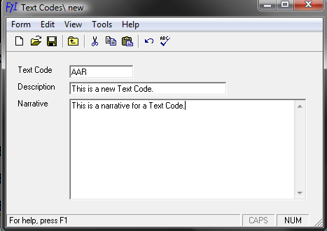 Click the New icon on the toolbar. This opens the Text Codes – New window.