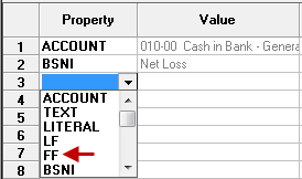 FF FF (Form Feed) Property April 16, 2024 17:58 Updated The listed steps assume you are in a Financial Statement form. The Form Feed property forces an advance to the top of the next page in Financial Statement Layouts. To setup a FF (Form Feed) property: Click on the Property column arrow and select FF. No further action is required.