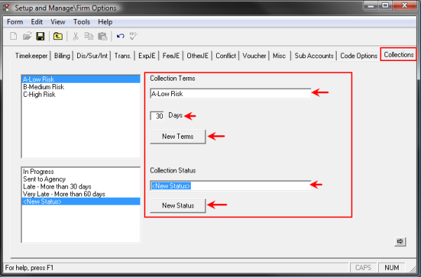 After you have created the Terms and Status and placed Juris in Normal mode, collection statuses are available within the application.