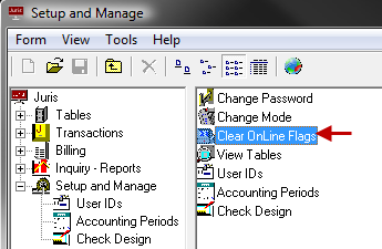 The Clear Online Flags function is used to unlock a user's work session that may have been locked due to an improper exit or ejection from the application.