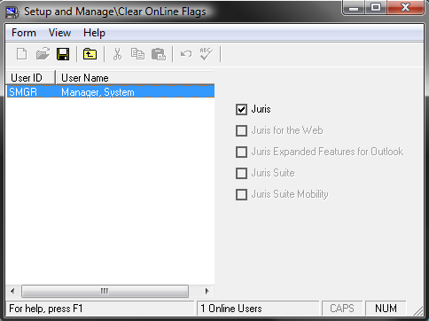 - Remove the check mark(s) beside the application(s) they are locked out of (Juris, Juris for the Web, Expanded Features for Outlook).