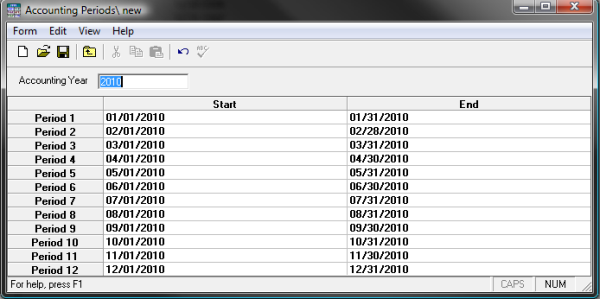 - Click the New icon on the toolbar to open the Accounting Periods form. Note that you can also select Form > New > Accounting Period from the menu, or press Ctrl + N on your keyboard.