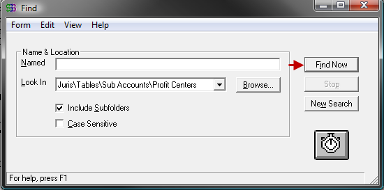 - Review the default settings. The Look In field displays the path: Juris\Tables\Profit Centers. The Search Subfolders option is enabled by default.