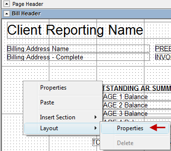 The Layout Properties are properties that apply to the bill layout as a whole. This means that settings made here affect the Bill Format as well as any attachments that may be designed (b.