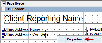 Each field in the bill designer has its own set of properties that offer further options for customization. All Fields (Data Fields, Label Fields and Image Fields) have the following tabs: Properties, Font and Borders. The options available on the Properties tab will differ based on the type of field selected (Date, Label or Image). Data Fields have the additional tabs of Select Field and Format. The Format tab is only available on Currency Fields, Date Fields, Numeric ( Fields and Percent fields, and the options available for formatting will differ whether the field selected is a Currency, Date, Numeric or Percent Field.