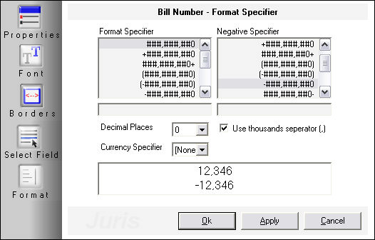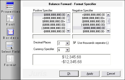 The Positive and Negative Specifications may be selected from the list, or User Defined may be chosen and the user can make their own specification for the number formatting.