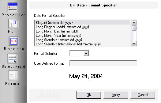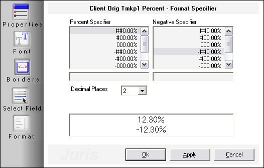 The Format tab is available on particular Data field types (Currency, Numeric , Date and Percent data field types). The options available on this tab vary based on the field type, but include basic options for formatting the number when positive, when negative, determining the number of decimal places, the currency or percent specification, etc.