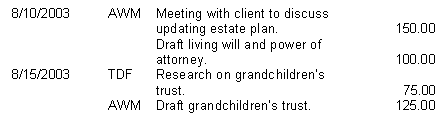 Example: The detail of a Fee Entry. The format may be designed to show date, timekeeper initials, narrative and amount. The output would look like this: