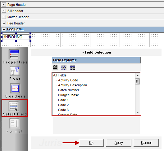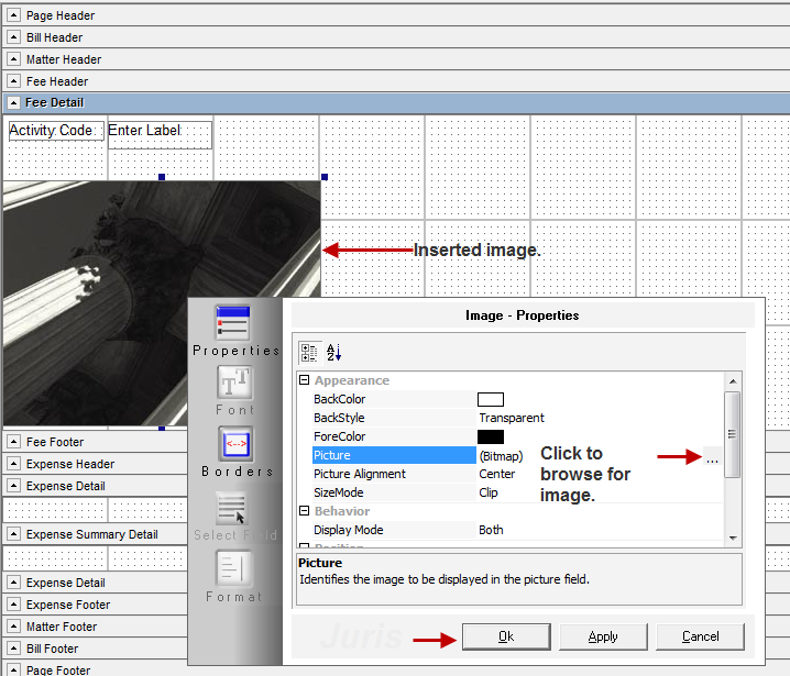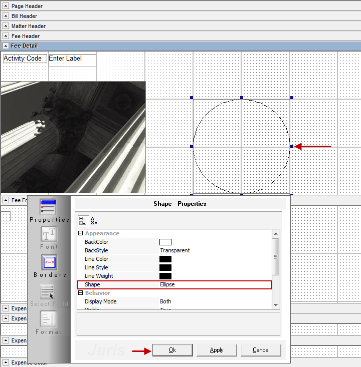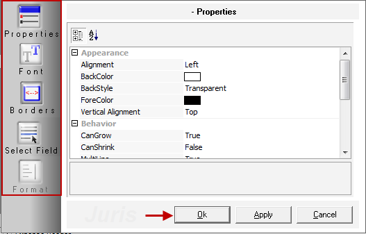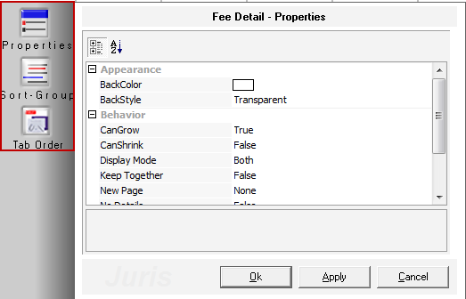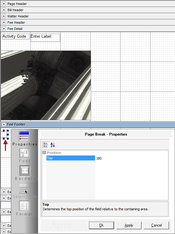 Use all of the property features within an area to customize the Bill Format. Look at the Property Values of an existing Juris Bill Format to learn more about creating a new one. Use the Preview button frequently to view the Bill Format as you create it.