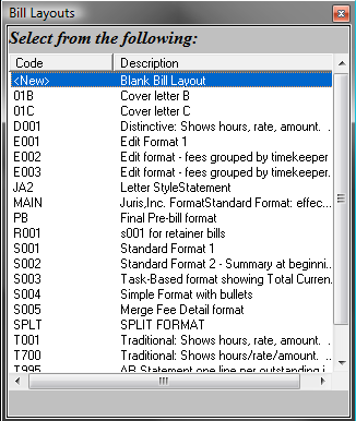 Select New > Blank Bill Layout to begin designing a format from scratch, or select any other format from the list to begin designing a new format based on that existing format.