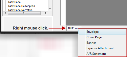 Right-click on the Bill Format tab and select the attachment type you want to add (cover page, banner page, envelope, etc.)