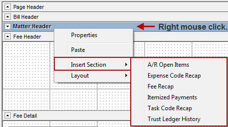 To add a Subsection, right-click on an area in the design where the subsection should be inserted, choose Insert Section, then select the appropriate subsection.