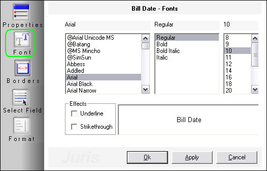 Although Font can be defined at the field level, we recommend that fonts be changed by designing and applying Styles to the fields in the format.