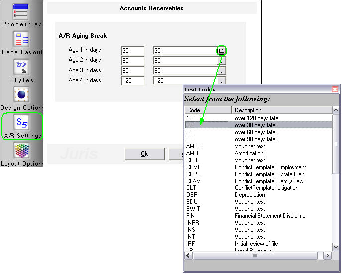 The Accounts Receivables tab allows you to establish the A/R aging breaks to use for the bill. To the right of each aging break is a box where a Text Code may be assigned. The text code assigned to the aging break will determine the text to be printed in the “Past Due Note” field that may be used in the Header or Footer of an A/R Statement.