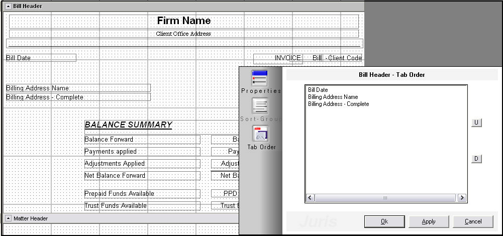 Only fields that are open for type-over editing will be listed in the tab order list. Notice in the example shown here that there are several fields in the Bill Header section, but only 3 are listed in the tab order option for that section.