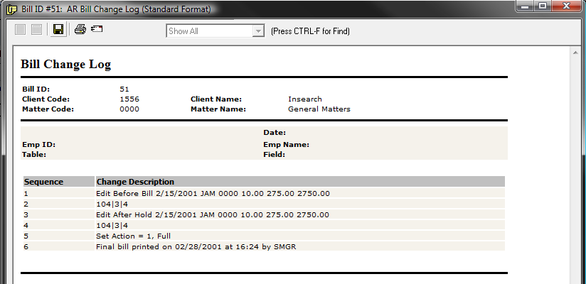 - This information can be viewed by right-clicking the bill number from Client/Matter Inquiry and selecting View Bill Change Log.