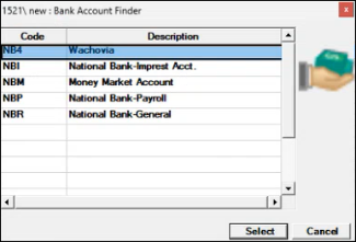 Click the three dots next to the Bank Account column to open the Bank Account Finder window. Click on the account you wish to use and click Select.