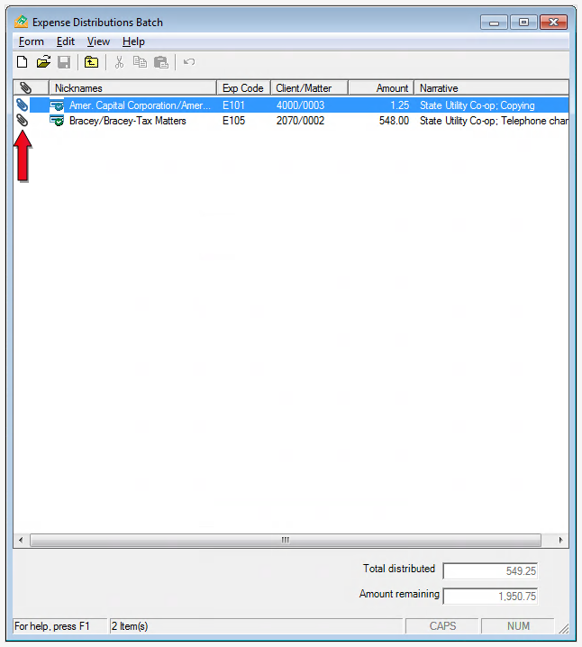 The Expense Distributions Batch dialog box appears, showing all defined expense distributions. If the batch contains an attachment, an icon appears in the left column (as highlighted below).