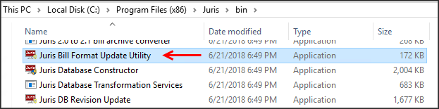 To start the utility, open the \Program Files (x86)\juris\bin folder and run the Juris Bill Format Update Utility.exe application file.