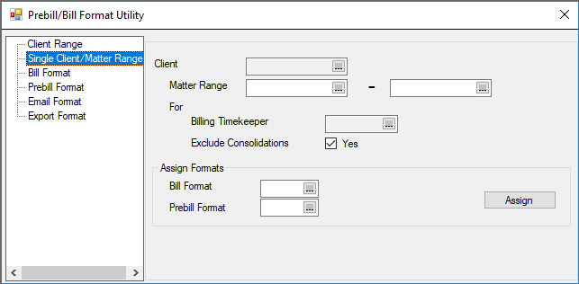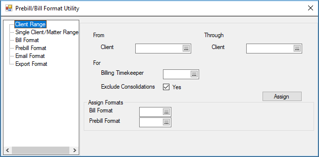 Use this option to assign a specific bill format and prebill format to a range of clients.