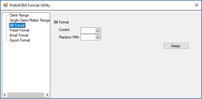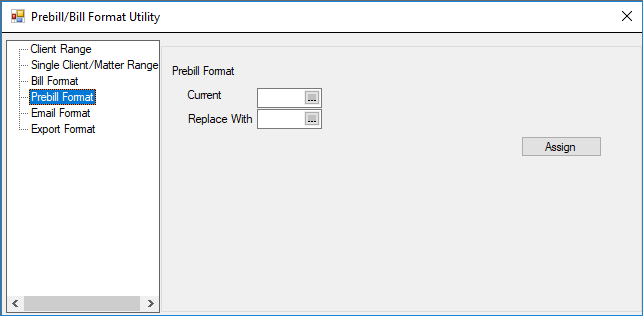 Use this option to update bill or prebill email from one file format to another. In the Current list, select the current email file format. In the Replace With list, select the format you want to use. Then click Assign.