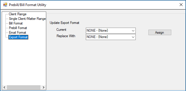 Use this option to update bill or prebill exports from one file format to another. In the Current list, select the current export file format. In the Replace With list, select the format you want to use. Then click Assign.