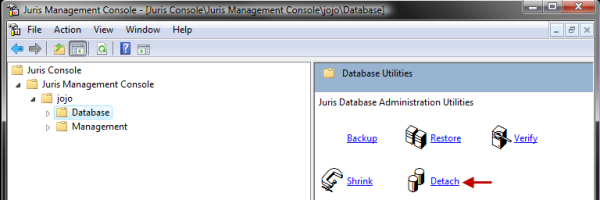 Click the Detach link in the Database Utilities section of the Juris Management Console.