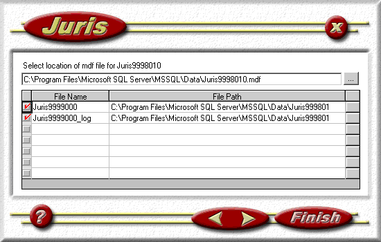 This screen will confirm the JBills file and log which are about to be attached along with the previously selected database. If the default is not correct, you can use the browse […] button to find the correct JBills files. Once the information is correct, click the right arrow to continue.