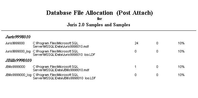 A report automatically displays at the end of the procedure. It contains information on the Juris database and also the JBills (archived bills) file if applicable. It may be printed if needed for record keeping.