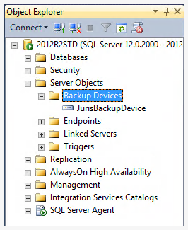 - In the Device name text box, enter a descriptive name for the new backup device (for example: JurisBackupDevice). This name will appear on the SQL Server Management Studio dialog box.