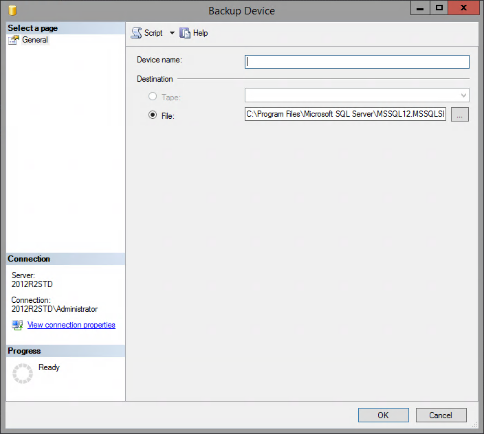 When creating a backup using SQL Server Management Studio, you can choose different devices on which to store the backup. Devices allow you to predefine the backup location and file name, instead of doing so when actually creating the backup. In short, they simplify the overall backup process. However, before you can choose a device during the database backup process, you need to create the device, as described below.