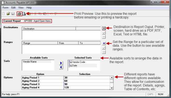 - To select or change a report’s output format or destination printer, use the drop down menu in the Destinations field.