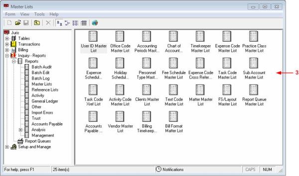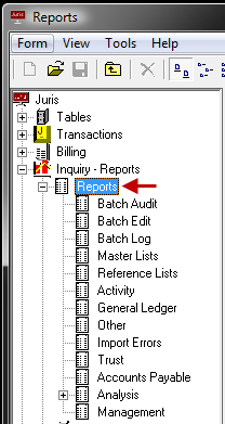 The Reports section lists all Juris Reports. The reports are sorted by categories. Click on Reports and the list of report categories will appear. Click on a category to see the reports available. Select any report by double clicking the specific report. Once a report is selected, a window will appear that shows the options available for printing a report. That window and a description of the options are shown below.