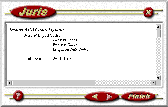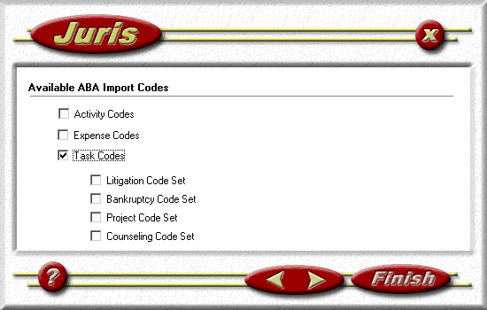 In this window, you may select the type of ABA codes to be imported into your database. Select from Activity Codes, Expense Codes and Task Codes. They may all be checked for import at the same time if all the codes are needed.