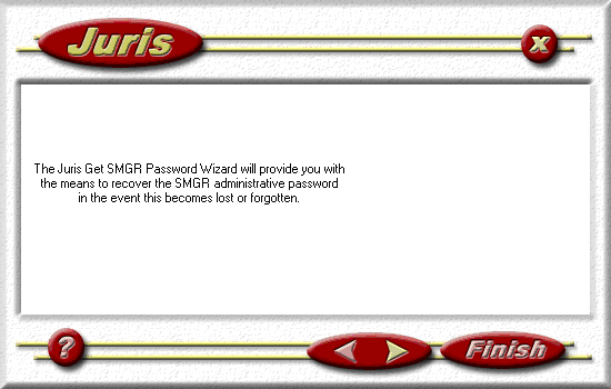 At times, the person with SMGR authorization may forget that password. This utility allows the SMGR password to be retrieved through the help of Juris Support. To recover the password, first click on the Get SMGR Password icon. This screen will be displayed. Click on the yellow Right arrow button to continue.